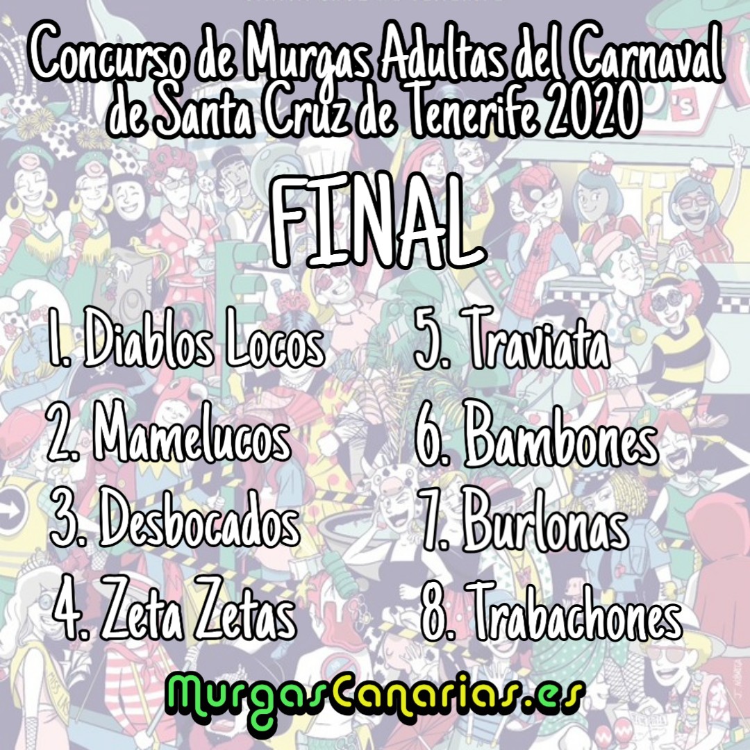 Carnaval Tenerife Finalistas del Concurso de Murgas Adultas de Santa Cruz de Tenerife 2020 Murgas Canarias 6 febrero, 2020 Este será el orden de actuación de la Final de Murgas de Santa Cruz de Tenerife 2020 View Comments (1) 1 Comment Deja tu comentario Cancelar la respuestaTu dirección de correo electrónico no será publicada. Los campos obligatorios están marcados con *Comentario * Nombre * Correo electrónico * Web Guarda mi nombre, correo electrónico y web en este navegador para la próxima vez que comente. cinco + uno = Carnaval Tenerife 6 febrero, 2020 Artículos relacionados