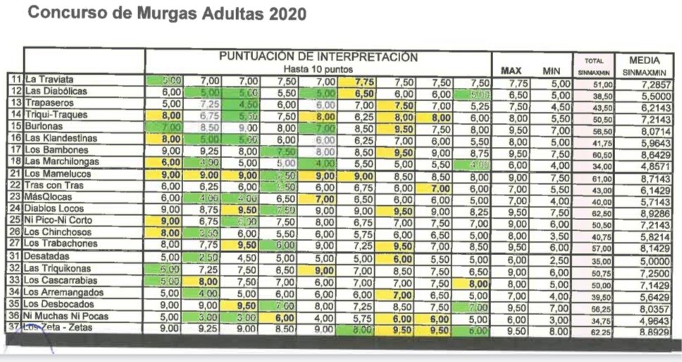 Puntuación de Fases del Concurso de Murgas Adultas de Santa Cruz de Tenerife 2020