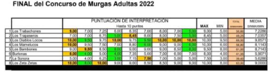 PUNTUACIONES CONCURSO DE MURGAS ADULTAS DEL CARNAVAL DE SANTA CRUZ DE TENERIFE 2022