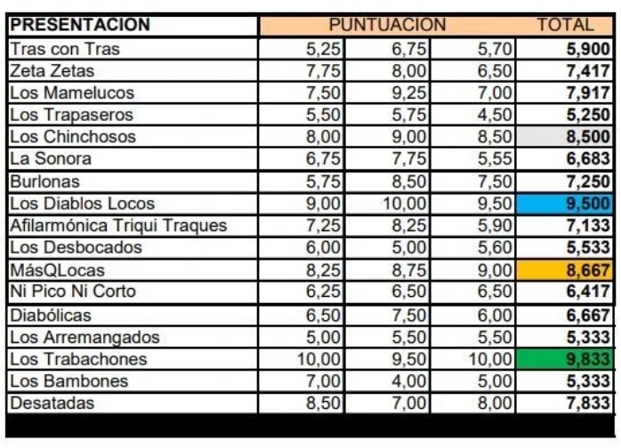 En un segundo nivel, Trabachones, en sexto puesto con 7,22, seguido de Trapaseros, que recibió 7,06 puntos. Y ya cerrando la clasificación de la final, Burlonas, con 5,90, y La Sonora, con 5,63.