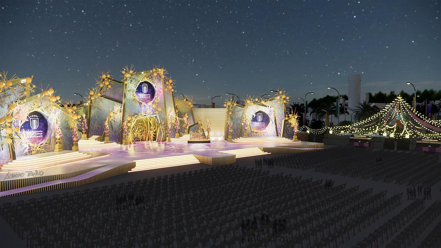 Celosía palillera y más de mil esferas doradas de diferentes diámetros contribuirán a dar una mayor profundidad al espacio escénico en el que también se podrán observar más de una decena de jarrones de más de cinco metros de altura coronados con ornamentación frutal, según ha explicado Trujillo, en honor al artista grancanario Néstor Martín Fernández de la Torre. Asimismo, se proyectará una gran bola del mundo sobre el suelo del escenario en alusión a la temática de la próxima edición de la fiesta.