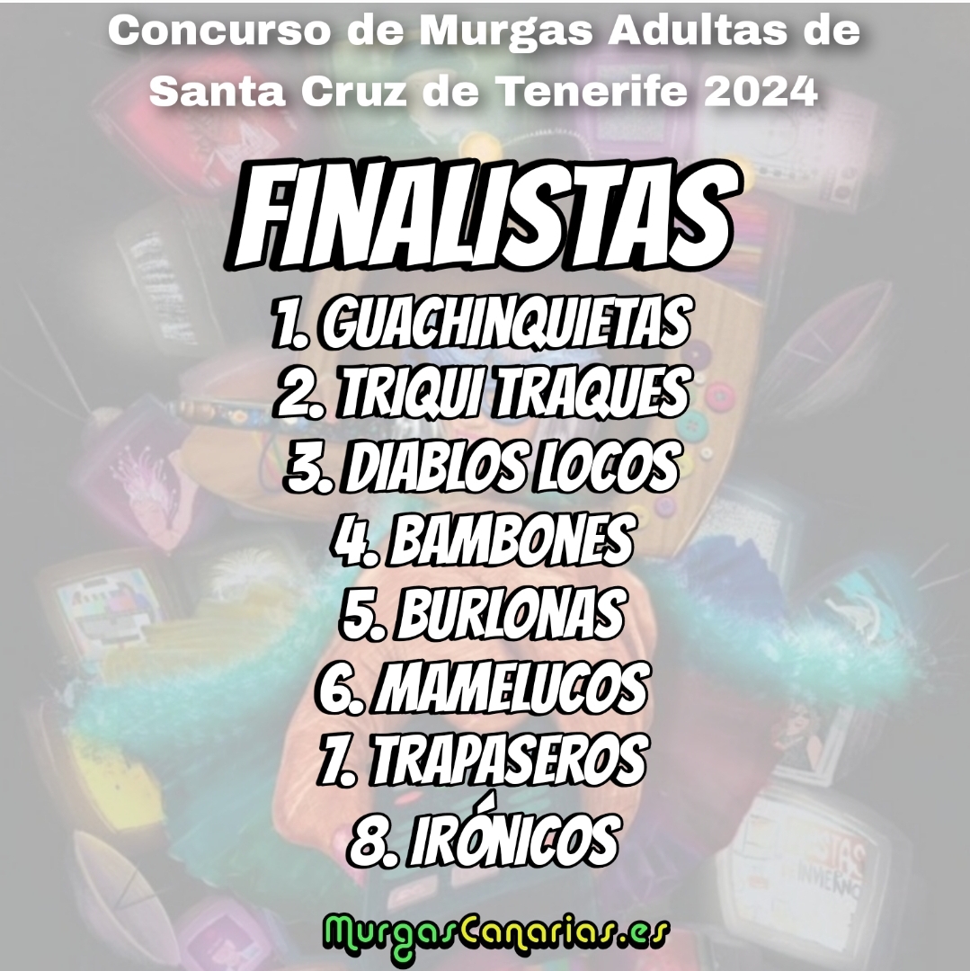Carnaval Tenerife Finalistas del Concurso de Murgas Adultas de Santa Cruz de Tenerife 2024 Murgas Canarias 25 enero, 2024 Haz Click para comentar Deja tu comentario Cancelar la respuestaTu dirección de correo electrónico no será publicada. Los campos obligatorios están marcados con *Comentario * Nombre * Correo electrónico * Web Guarda mi nombre, correo electrónico y web en este navegador para la próxima vez que comente. cinco × 2 = Carnaval Tenerife 25 enero, 2024 Artículos relacionados