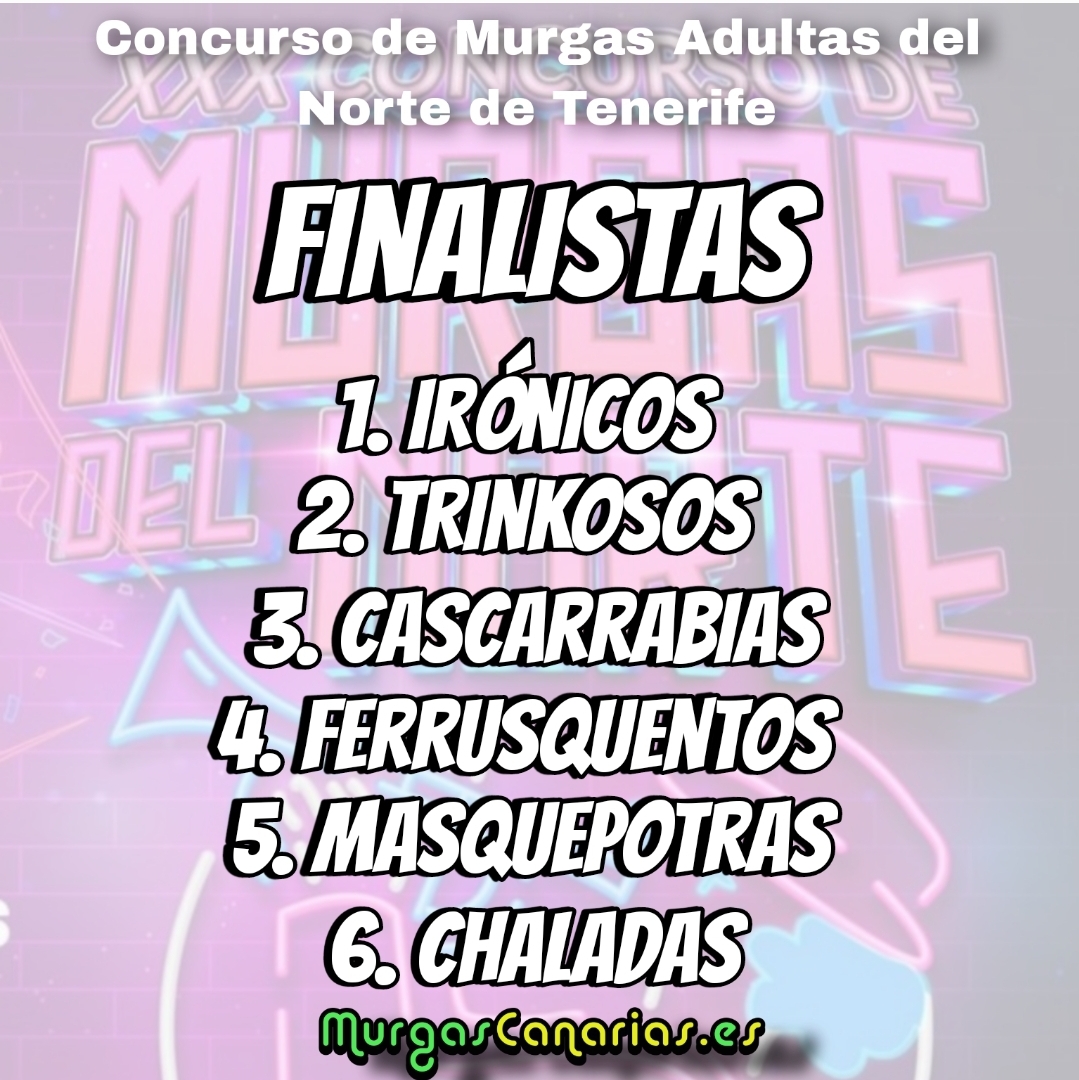 Carnaval Tenerife Finalistas del Concurso de Murgas Adultas del Norte de Tenerife 2024 Murgas Canarias 31 enero, 2024 Haz Click para comentar Deja tu comentario Cancelar la respuestaTu dirección de correo electrónico no será publicada. Los campos obligatorios están marcados con *Comentario * Nombre * Correo electrónico * Web Guarda mi nombre, correo electrónico y web en este navegador para la próxima vez que comente. × = Carnaval Tenerife 31 enero, 2024 Artículos relacionados