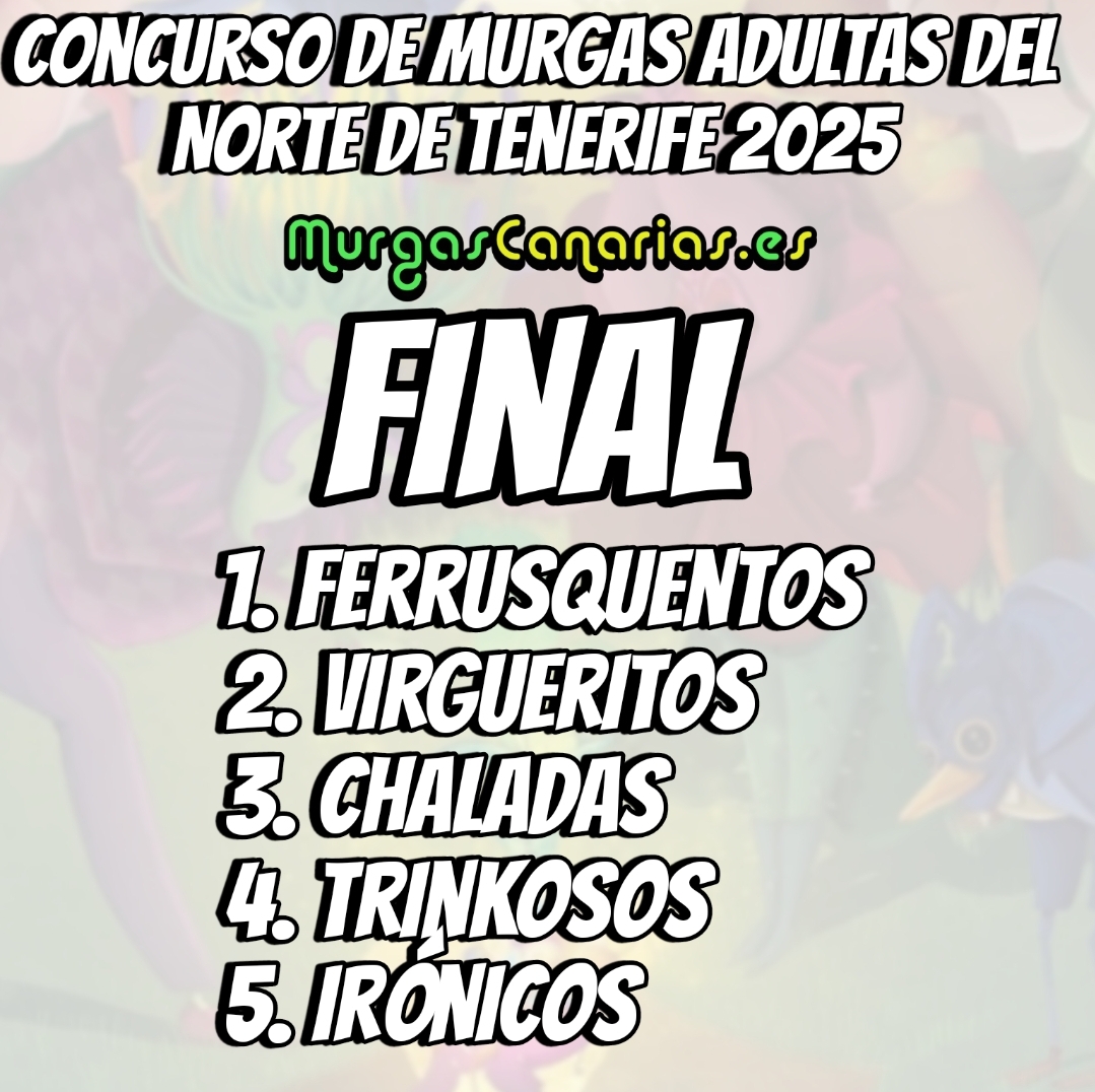 Carnaval Tenerife Finalistas del Concurso de Murgas Adultas del Norte de Tenerife 2025 Murgas Canarias 20 febrero, 2025 FINALISTAS Y SORTEO DE ORDEN DE ACTUACIÓN Haz Click para comentar Deja tu comentario Cancelar la respuestaTu dirección de correo electrónico no será publicada. Los campos obligatorios están marcados con *Comentario * Nombre * Correo electrónico * Web Guarda mi nombre, correo electrónico y web en este navegador para la próxima vez que comente. + tres = Carnaval Tenerife 20 febrero, 2025 Artículos relacionados