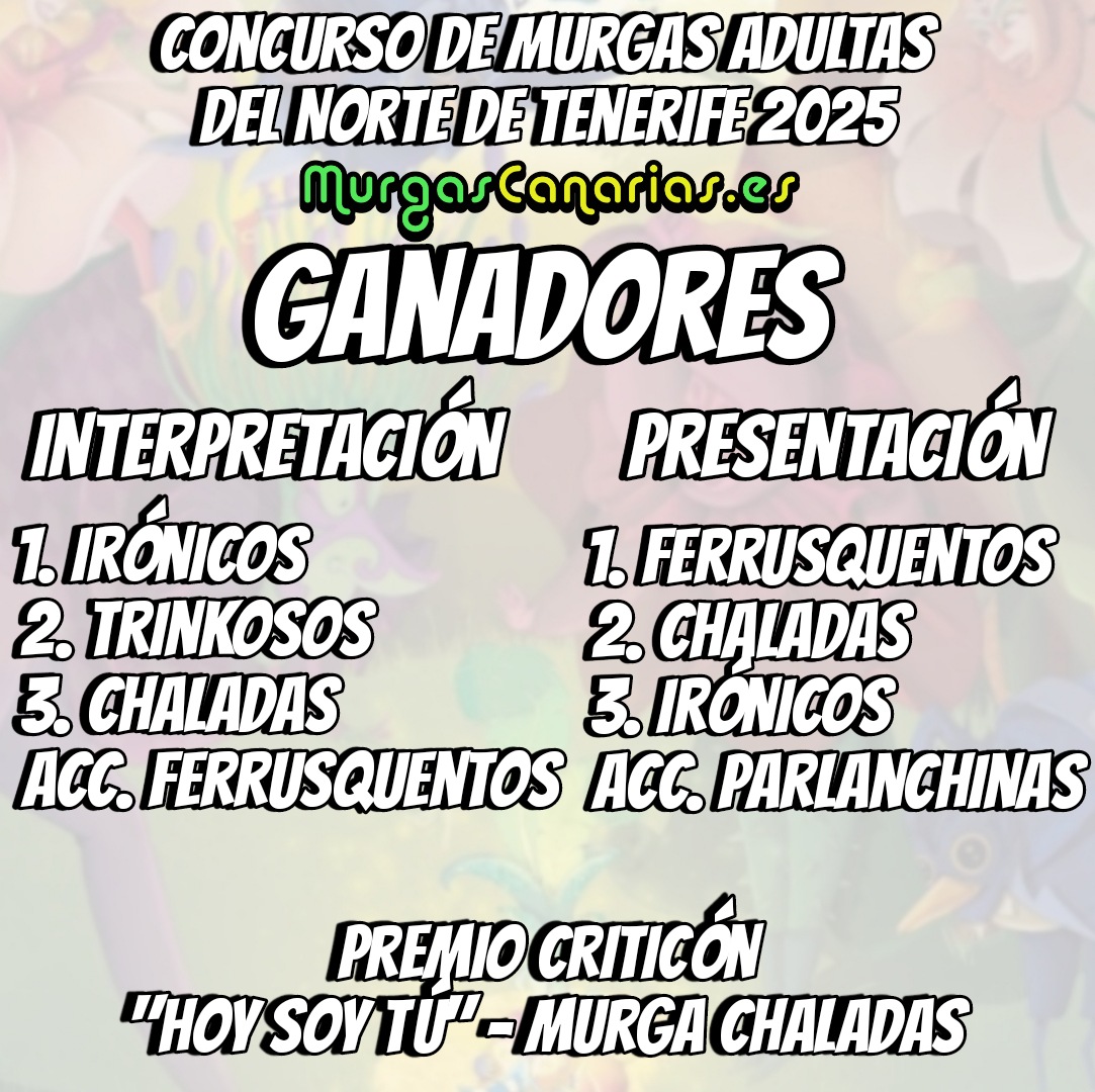Carnaval Tenerife Ganadores del Concurso de Murgas Adultas del Norte de Tenerife 2025 Murgas Canarias 23 febrero, 2025 Haz Click para comentar Deja tu comentario Cancelar la respuestaTu dirección de correo electrónico no será publicada. Los campos obligatorios están marcados con *Comentario * Nombre * Correo electrónico * Web Guarda mi nombre, correo electrónico y web en este navegador para la próxima vez que comente. dos × = dieciocho Carnaval Tenerife 23 febrero, 2025 Artículos relacionados