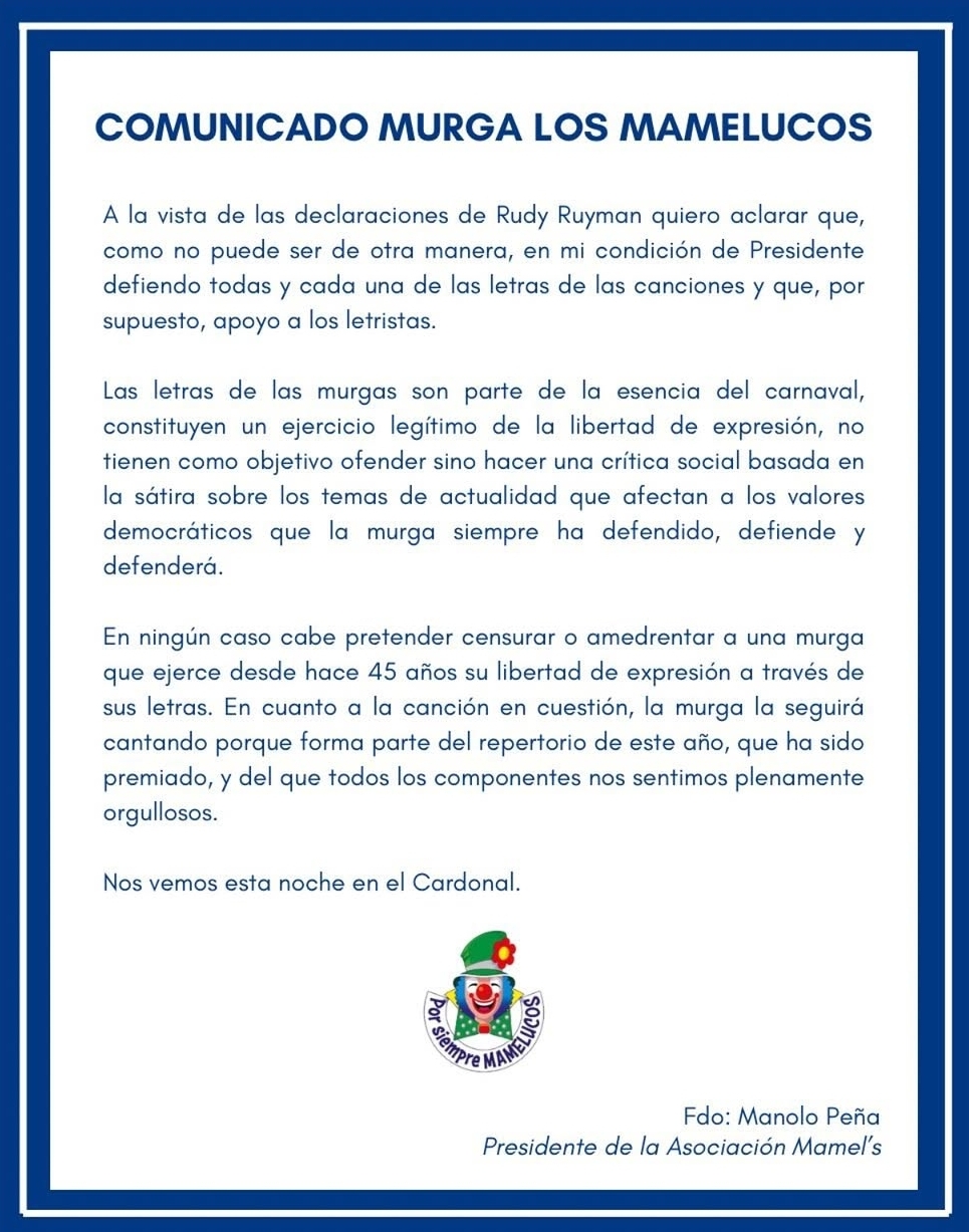 En un comunicado difundido recientemente, Manolo Peña, presidente de la Asociación Mamel’s y representante de la conocida Murga Los Mamelucos, ha salido al paso de las declaraciones de Rudy Ruyman que, según su mensaje, intentan cuestionar las letras de las canciones presentadas por el grupo durante la actual temporada de carnaval.