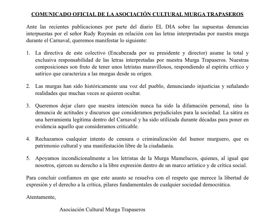 En respuesta a recientes publicaciones acerca de presuntas denuncias presentadas por Rudy Ruyman debido a las letras interpretadas por la Murga Trapaseros y la Murga Mamelucos durante el Carnaval, la Asociación Cultural Murga Trapaseros ha emitido un comunicado oficial manifestando su postura y aclarando diversos puntos.