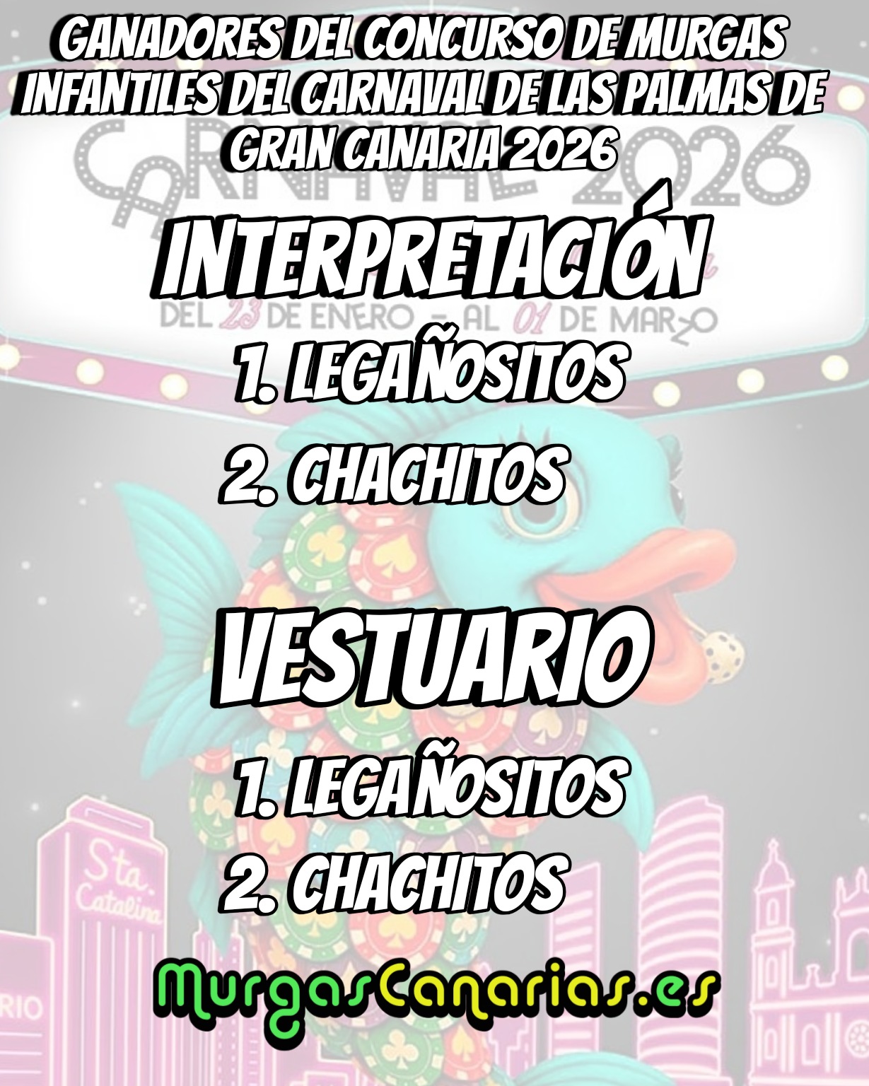 Carnaval Gran Canaria Ganadores del Concurso de Murgas Infantiles de Las Palmas de Gran Canaria 2026 Murgas Canarias 24 enero, 2026 Noticias relacionadas:Ganadores del Certamen de Murgas Infantiles del Norte de Tenerife 2026Murga Infantil Raviscuditos 2026 - Actuación CompletaMurga Infantil Tiralengüines 2026 - Actuación Completa Haz Click para comentar Deja tu comentario Cancelar la respuestaTu dirección de correo electrónico no será publicada. Los campos obligatorios están marcados con *Comentario * Nombre * Correo electrónico * Web Guarda mi nombre, correo electrónico y web en este navegador para la próxima vez que comente. 1 + = 4 Carnaval Gran Canaria 24 enero, 2026 Artículos relacionados
