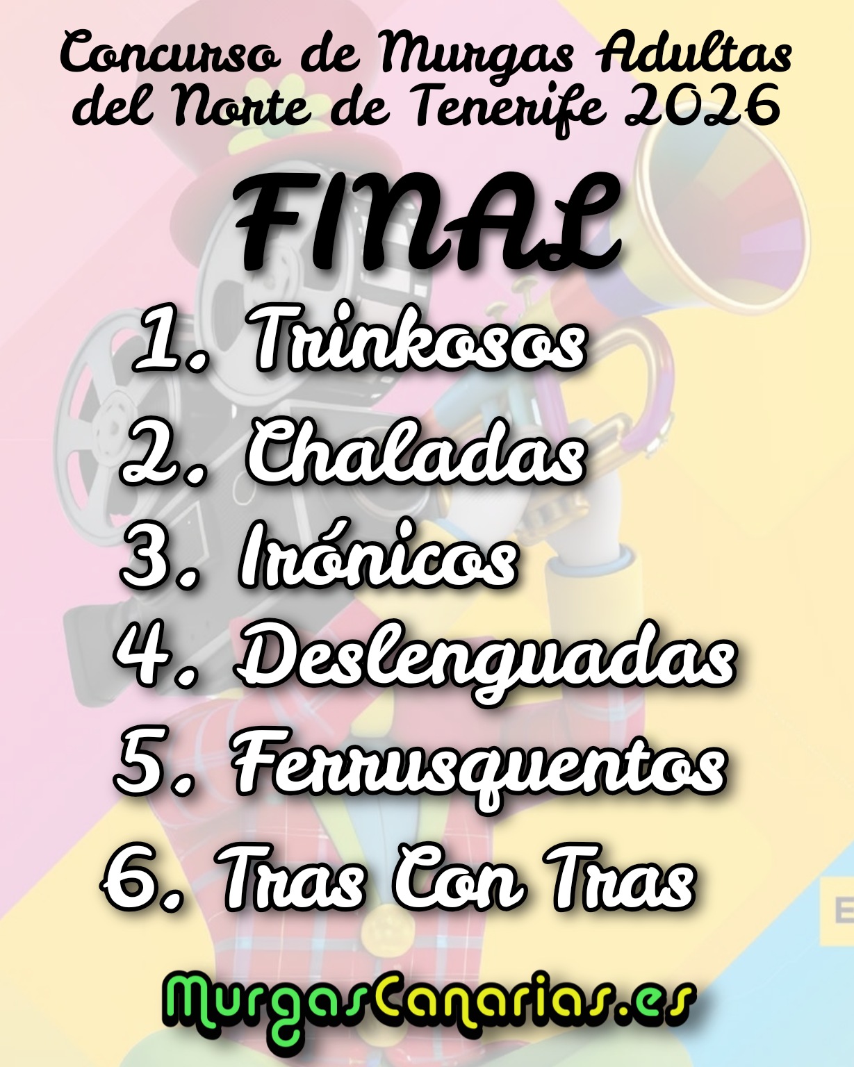 Carnaval Tenerife Finalistas y Orden de Final del Concurso de Murgas Adultas del Norte de Tenerife 2026 Murgas Canarias 5 febrero, 2026 Noticias relacionadas:Resumen de la Tercera Fase de Murgas Adultas del Norte de Tenerife 2026Murga Trinkosos 2026 - Actuación Completa de FaseMurga Deslenguadas 2026 - Actuación Completa de Fase Haz Click para comentar Deja tu comentario Cancelar la respuestaTu dirección de correo electrónico no será publicada. Los campos obligatorios están marcados con *Comentario * Nombre * Correo electrónico * Web Guarda mi nombre, correo electrónico y web en este navegador para la próxima vez que comente. tres + = 12 Carnaval Tenerife 5 febrero, 2026 Artículos relacionados
