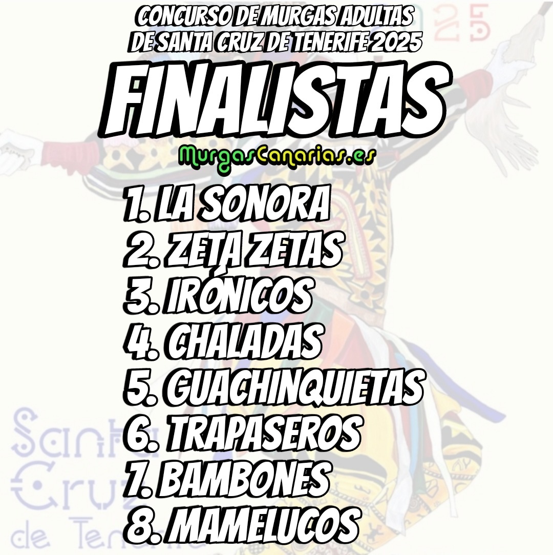 Carnaval Tenerife Estas son las murgas finalistas del Concurso de Murgas de Santa Cruz de Tenerife 2025 Murgas Canarias 13 febrero, 2025 Haz Click para comentar Deja tu comentario Cancelar la respuestaTu dirección de correo electrónico no será publicada. Los campos obligatorios están marcados con *Comentario * Nombre * Correo electrónico * Web Guarda mi nombre, correo electrónico y web en este navegador para la próxima vez que comente. − 3 = 3 Carnaval Tenerife 13 febrero, 2025 Artículos relacionados