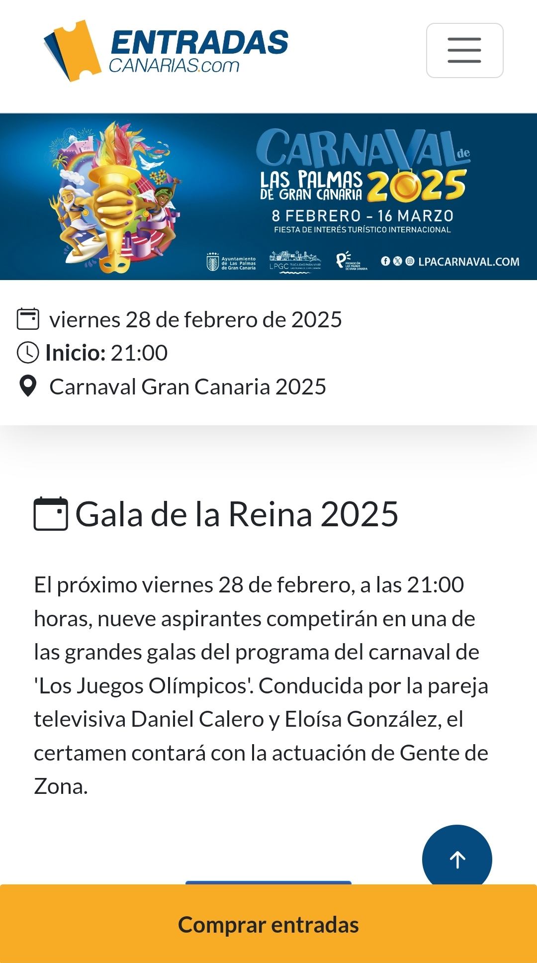 Carnaval Gran Canaria Compra aquí tus entradas para la Gala de la Reina de Las Palmas de Gran Canaria 2025 Murgas Canarias 21 febrero, 2025 Disponibles a partir de las 9:00h. Haz Click para comentar Deja tu comentario Cancelar la respuestaTu dirección de correo electrónico no será publicada. Los campos obligatorios están marcados con *Comentario * Nombre * Correo electrónico * Web Guarda mi nombre, correo electrónico y web en este navegador para la próxima vez que comente. − 6 = 1 Carnaval Gran Canaria 21 febrero, 2025 Artículos relacionados
