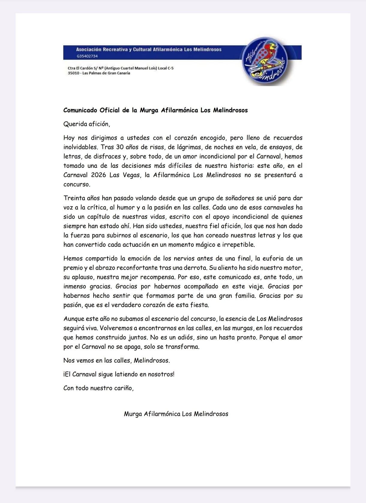 Tras 30 años de risas, de lágrimas, de noches en vela, de ensayos, de letras, de disfraces y, sobre todo, de un amor incondicional por el Carnaval, hemos tomado una de las decisiones más difíciles de nuestra historia: este año, en el Carnaval 2026 de Las Palmas de Gran Canaria, la Afilarmónica Los Melindrosos no se presentará al concurso.