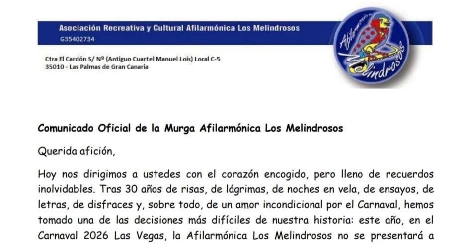 “Tras 30 años de risas, lágrimas, noches en vela, ensayos, letras y disfraces, hemos tomado una de las decisiones más difíciles de nuestra historia: este año, en el Carnaval 2026, la Afilarmónica Los Melindrosos no se presentará a concurso”, recoge el comunicado oficial.