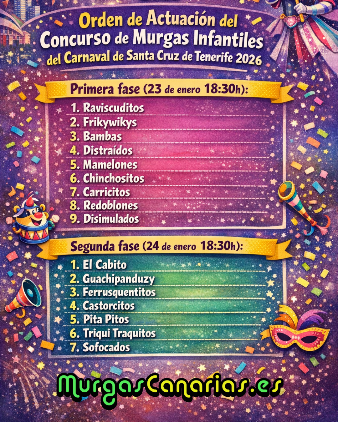 El Carnaval 2026 se presenta con una temática vibrante: Ritmos Latinos, un homenaje a la música y la cultura del Caribe que promete llenar de color y alegría las calles tinerfeñas. Con el orden ya definido, las agrupaciones ultiman ensayos y preparativos para ofrecer el mejor espectáculo de la fiesta más internacional de Canarias.