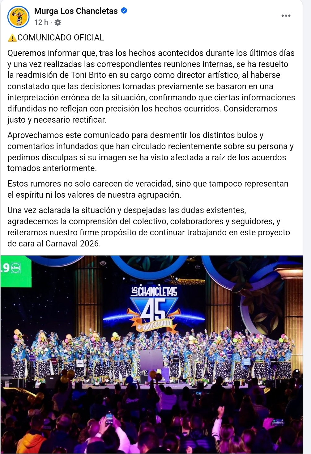 La murga Los Chancletas, histórica formación de La Isleta en Las Palmas de Gran Canaria, ha anunciado este viernes la readmisión de Toni Brito como director artístico, tras revisar los hechos que motivaron su reciente salida del colectivo.