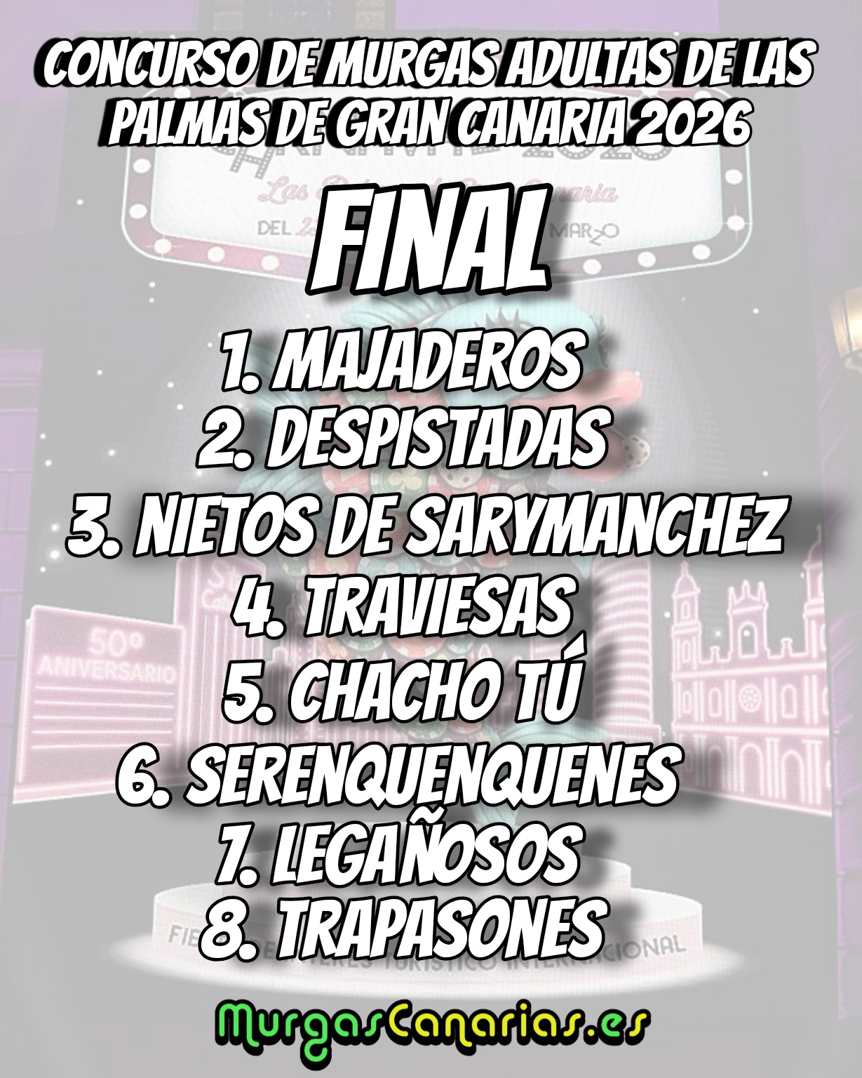 Carnaval Gran Canaria Finalistas y Sorteo de Orden del Concurso de Murgas Adultas de Las Palmas de Gran Canaria 2026 Murgas Canarias 6 febrero, 2026 FINALISTAS Y SORTEO DE ORDEN Noticias relacionadas:Puntuaciones de Fase del Concurso de Murgas Adultas de Las Palmas de Gran Canaria 2026Resumen de la Cuarta Fase de Murgas Adultas de Las Palmas de Gran Canaria 2026Murga Los Legañosos 2026 – Actuación Completa de Fase Haz Click para comentar Deja tu comentario Cancelar la respuestaTu dirección de correo electrónico no será publicada. Los campos obligatorios están marcados con *Comentario * Nombre * Correo electrónico * Web Guarda mi nombre, correo electrónico y web en este navegador para la próxima vez que comente. × 8 = 16 Carnaval Gran Canaria 6 febrero, 2026 Artículos relacionados