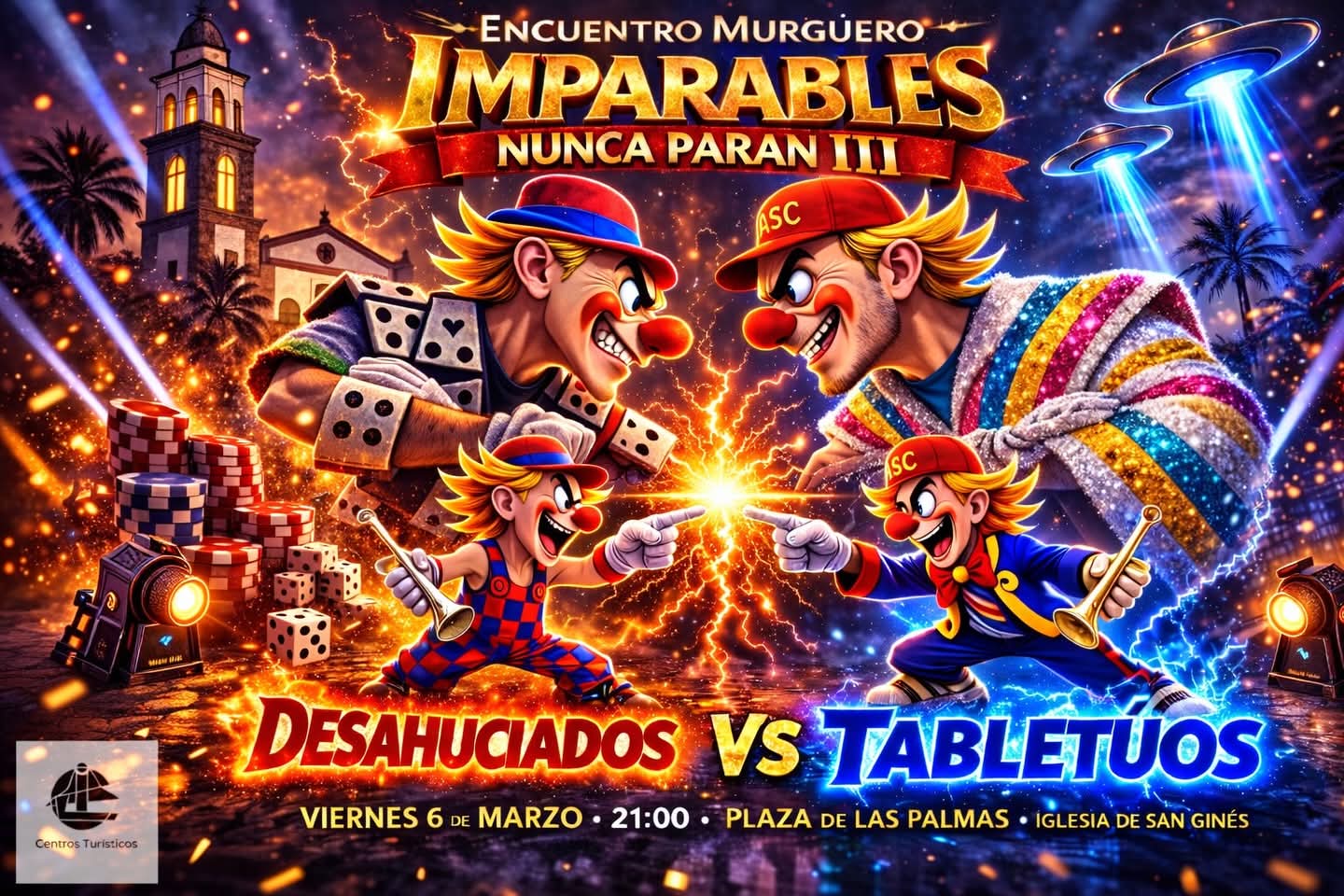 El duelo artístico entre Desahuciados y Tabletúos se presenta como un cara a cara musical donde ambas agrupaciones desplegarán sus mejores temas, manteniendo vivo el espíritu murguero que caracteriza estas fechas. Un intercambio de estrofas y chío chíos en el que no faltarán guiños a la actualidad ni referencias locales.