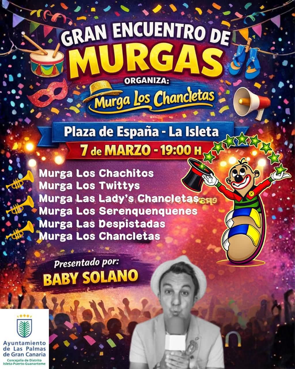 La plaza del Pueblo (Plaza de España) de La Isleta acogerá este viernes 7 de marzo, a partir de las 19:00 horas, un gran encuentro de murgas que reunirá a varias agrupaciones del Carnaval de Las Palmas de Gran Canaria en una noche marcada por la música, el humor y el espíritu murguero.