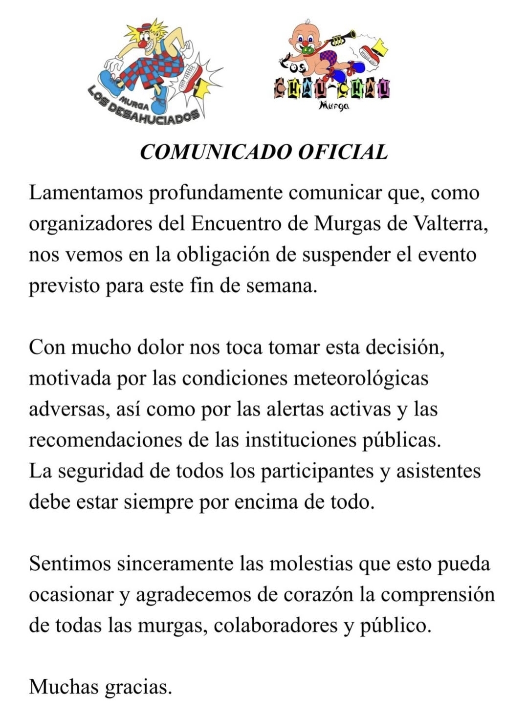 La murga Los Desahuciados, organizadores del Encuentro de Murgas de Valterra han anunciado la suspensión del evento previsto para este fin de semana debido a las condiciones meteorológicas adversas y a las alertas activas, además de las recomendaciones emitidas por las instituciones públicas.